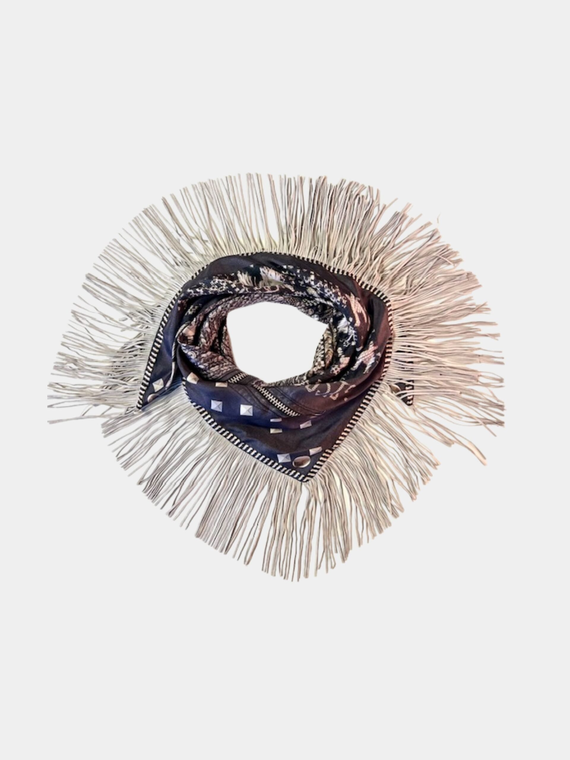 Dieser wunderschöne, dreieckige Schal zeigt ein feines Zusammenspiel aus geometrischen und abstrakten Mustern in tiefen Tönen von Blau, Braun und Sand. Die langen, hellbeigen Fransen verleihen dem Schal einen modernen und zugleich luxuriösen Look. Außerdem besteht er aus 100% reiner Seide. Dadurch fühlt sich der Stoff weich an, fällt leicht und verleiht jedem Outfit eine elegante Note.